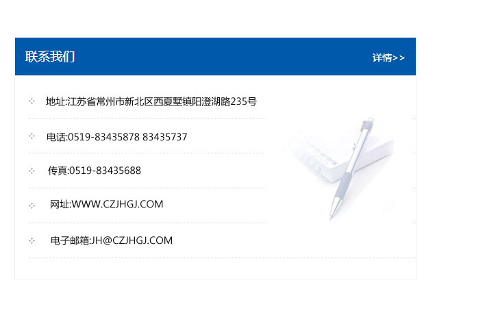 傳真:0519-83435688    郵編:213135    網址:WWW.czjhgj_com.8mak.com    電子郵箱:JH@czjhgj_com.8mak.com
